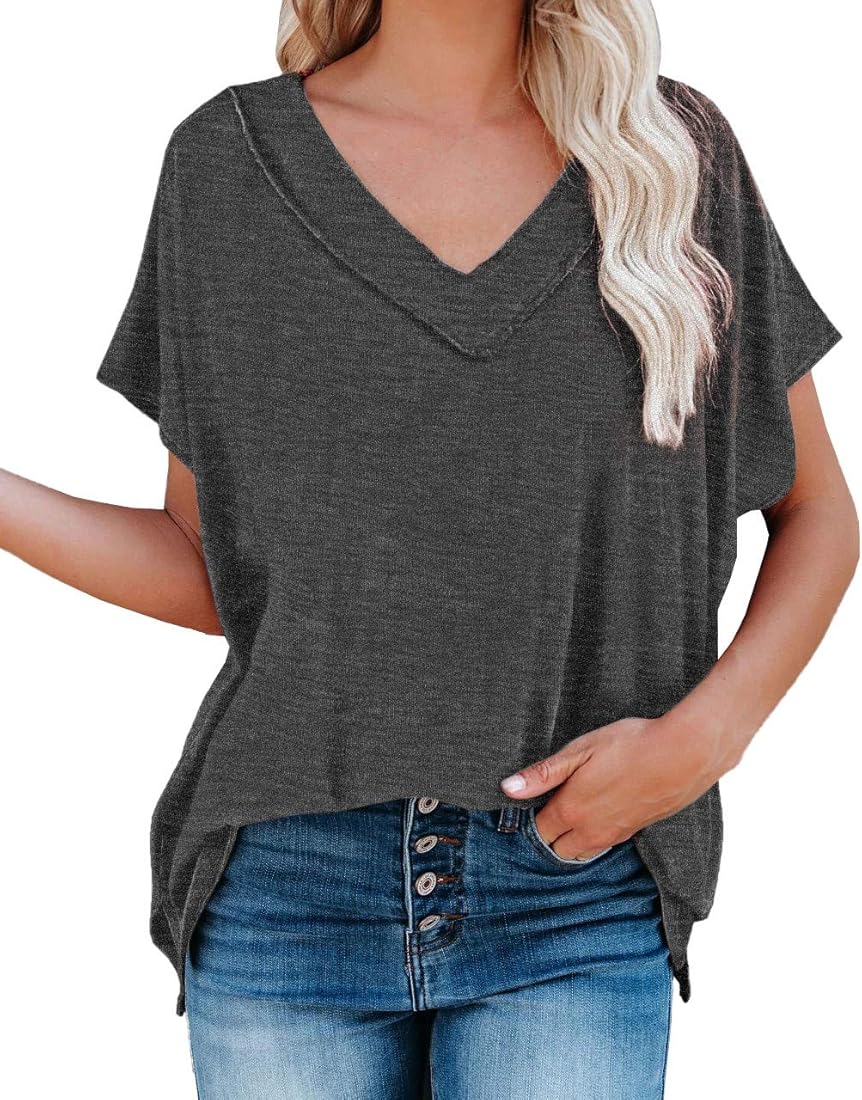 Uusollecy Women S T Shirt Summer V Neck Basic Short Sleeve Shirts Plain Casual Loose Tops With Pocket Loose Blouse Tops For Women Teen Girls C Grey Plain Size S Amazon De Fashion